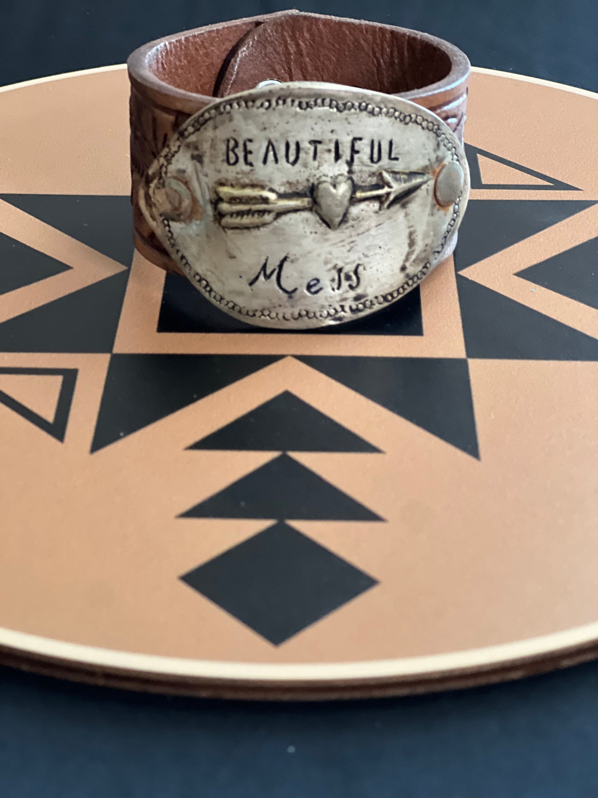 Hand Tooled Leather & Metal Cuff. Length measures 9”. Adjustable with two snaps fitting up to 7.5” wrist on last snap.