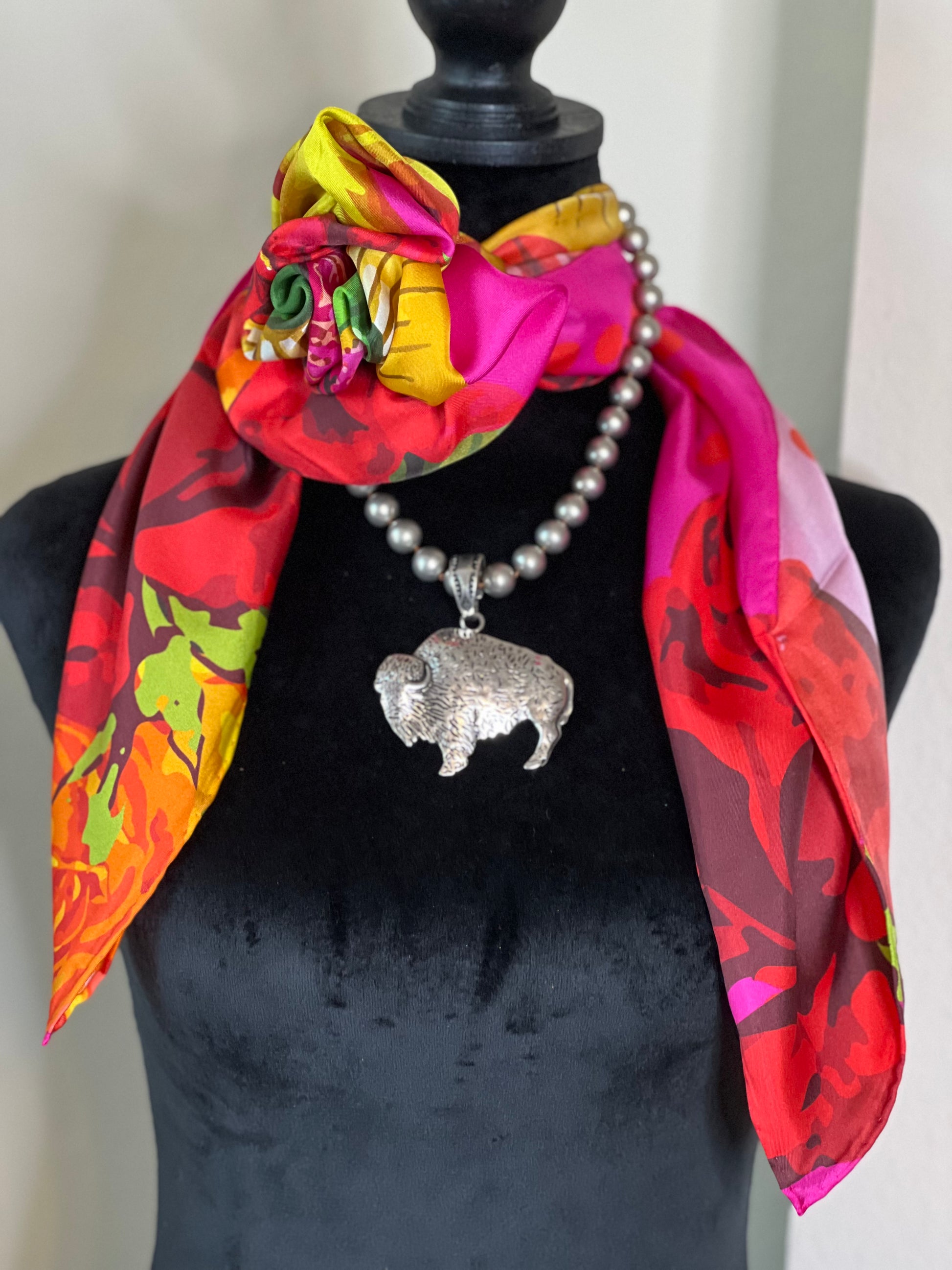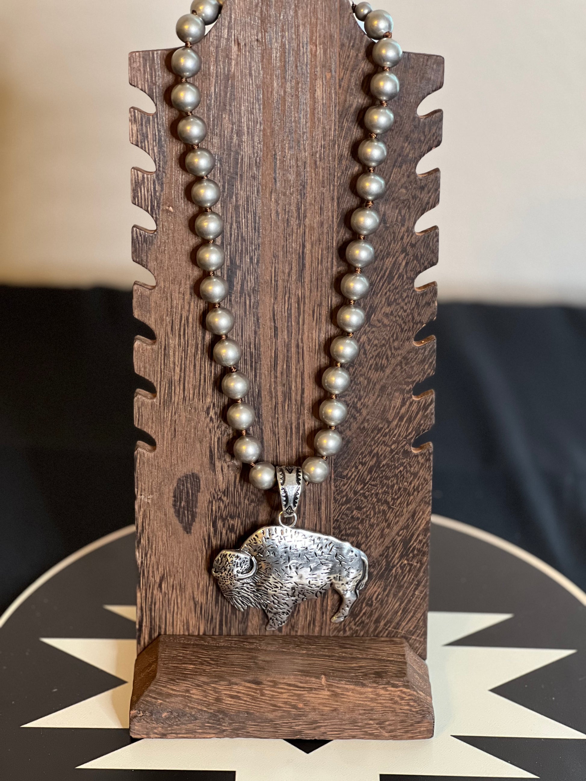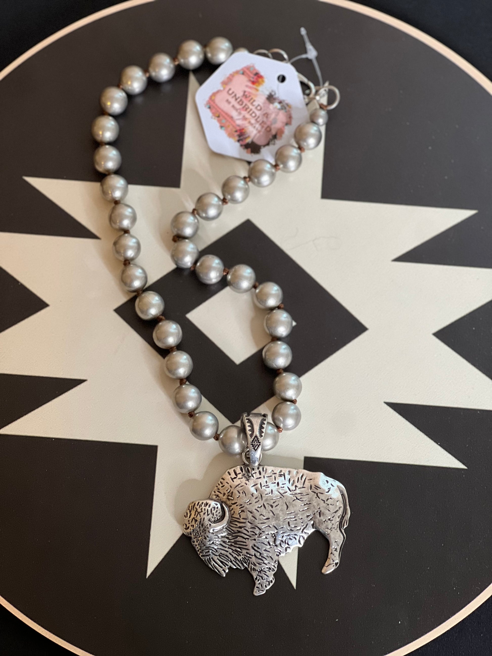 Inspired Silver Bead Necklace with Silver Buffalo Pendant.