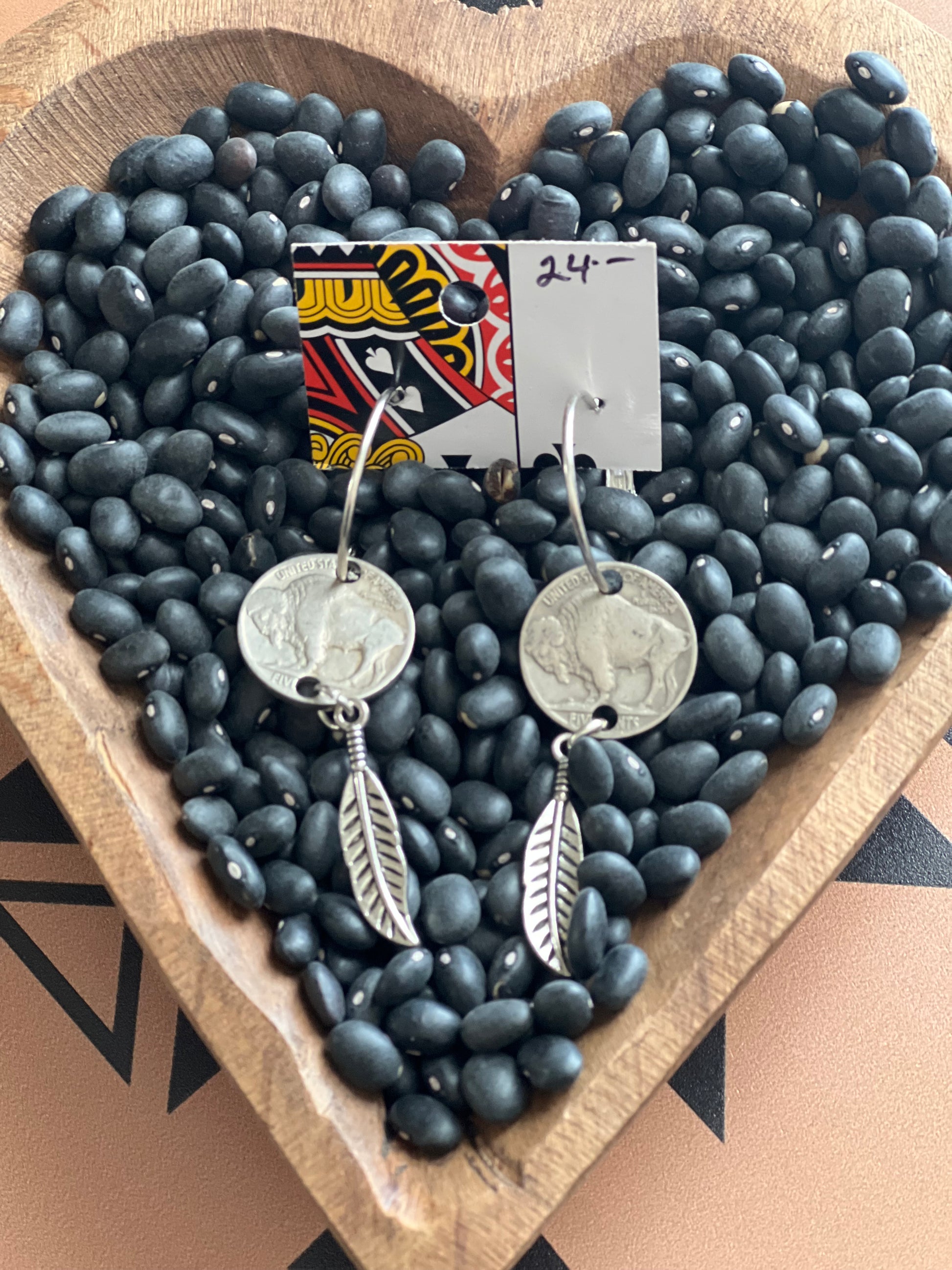 Buffalo Nickel Earrings with Feather - BUFFALO